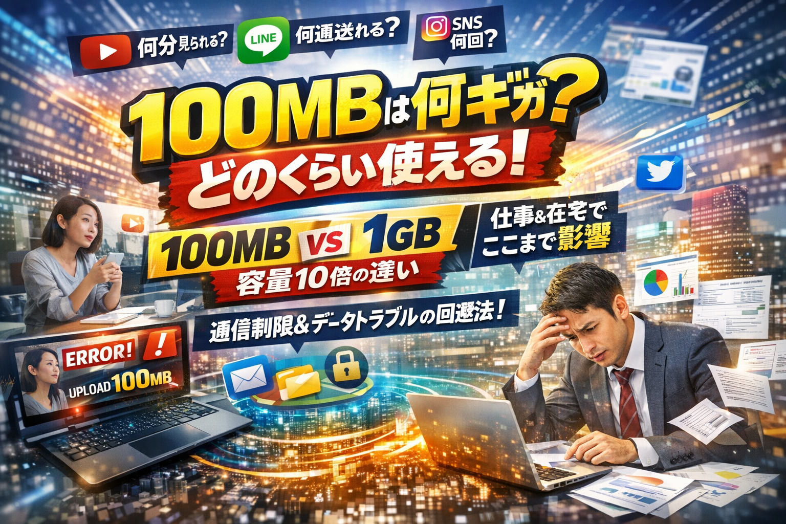 本記事では、100mb何ギガかという即答だけで終わらせず、100mbどのくらい動画が見られるか、LINEやInstagramが使えるか、100メガバイト1ギガの差が仕事の現場でどんなトラブルを生むかまで、実務ベースで整理します。ギガとメガどちらが大きいか、100mbと100Mbpsの違い、100MB動画送る際の現実的な判断軸も一度で整理できます。