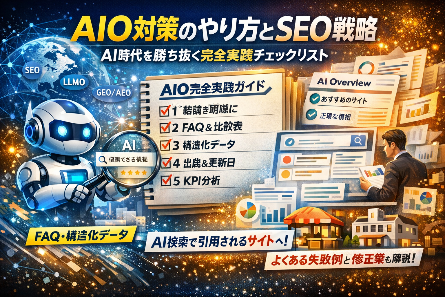 検索結果のAI要約やAIアシスタントの回答では、すでに「誰のサイトを公式情報として扱うか」が静かに選別されています。アクセスはあるのに問い合わせが伸びない、指名検索でもAIに自社が十分に引用されないとしたら、AIO対策の設計をしていないこと自体が機会損失になっています。しかも従来のSEO対策を少し強化するだけでは、この選別から外れたままです。必要なのはテクニックの寄せ集めではなく、「どの情報をどの構造でAIに渡すか」という設計図です。この記事では、AIOとは何か、SEOやLLMO・GEO・AEOとの違いから始めて、AIに引用されるための具体的なAIO対策のやり方を、5ステップの実践ガイドとチェックリストで整理します。FAQや比較表、構造化データ、出典と更新日の設計を、中小企業やローカルビジネス、BtoBサイトそれぞれの現場に落とし込み、飲食店やクリニックで起きている誤回答事例まで踏まえて解説します。さらに、ありがちな失敗パターンと修正プロセス、AIO対策ツールやAIO対策会社・LLMO対策会社の選び方、費用の考え方まで一気通貫で整理しました。今日から直せる箇所と半年かけて組み直す戦略の両方が手に入るので、この数分を投資せずにAI時代の検索に臨むことは、明確なビハインドになります。