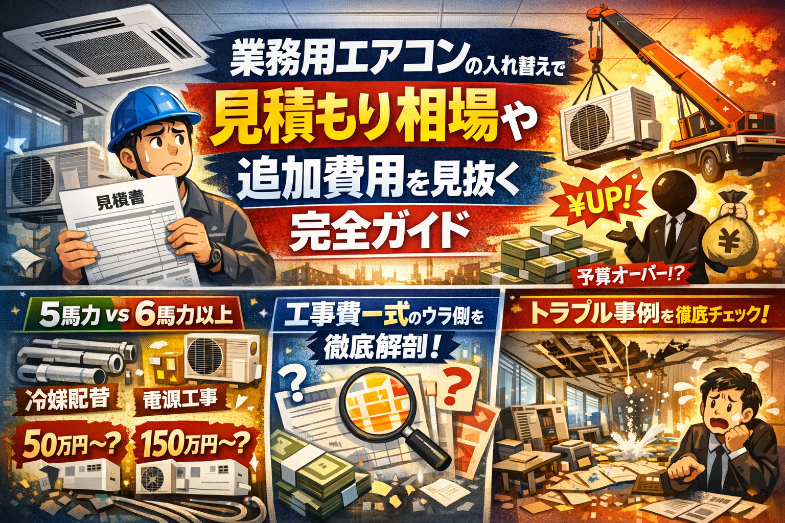 業務用エアコンの入れ替え見積書を前に、「高いのか妥当なのか」「工事費込みでどこまでが標準なのか」が曖昧なまま判子を押すと、数十万円単位で手残りが削られます。5馬力以下で50〜70万円、6馬力以上で100〜150万円前後という相場感はよく語られますが、実際に支払う金額を決めているのは、その裏に隠れた冷媒配管の扱い、電源工事、天井補修、クレーン費、フロン回収といった追加費用の設計です。しかも、これらは「工事費一式」「諸経費」としてまとめられ、標準工事と追加費用の境界線が見えないまま比較されがちです。