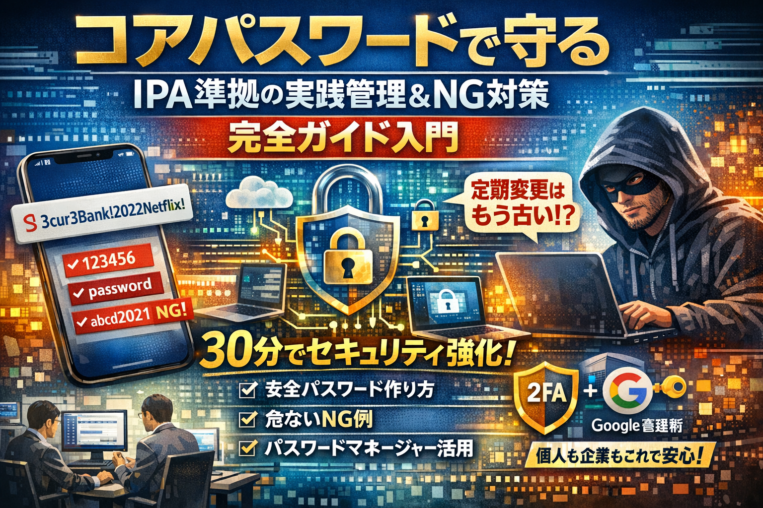 さらに、コアパスワード方式だけに頼るリスクや、「定期変更すれば安全」という古い常識が生む落とし穴も整理し、パスワードマネージャーやGoogleパスワードマネージャー、多要素認証との最適な組み合わせを具体的に提案します。個人と中小企業の運用差、UTMやクラウド環境での認証情報保護まで一気に俯瞰できる内容です。