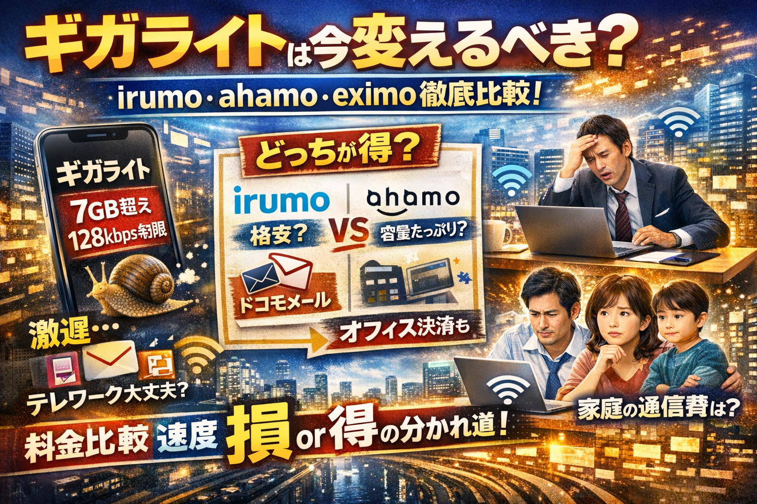 ここ数年、ギガライトを契約したまま料金だけを気にしている経営者や担当者から、「テレワーク中に急に会議が止まった」「irumoに変えたらドコモメール前提のワークフローが崩れた」という相談を繰り返し受けてきました。通信費削減のつもりが、クラウド業務や営業の移動中テザリングに支障が出て、結果的に残業と機会損失が増えているケースが少なくありません。