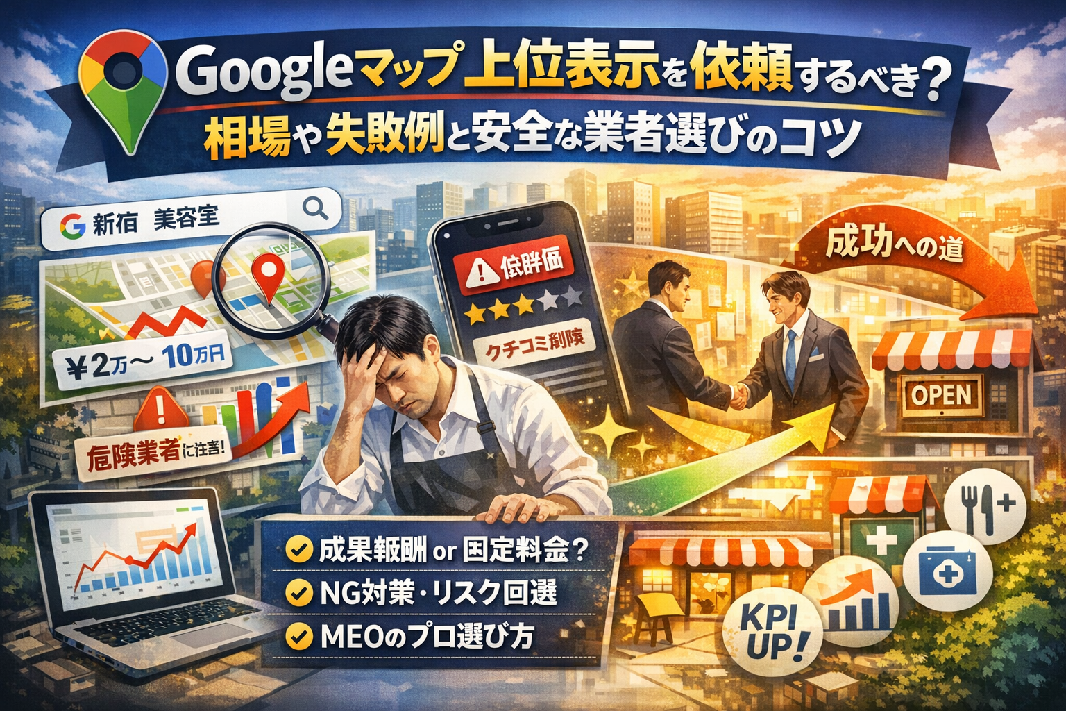 本記事は、Googleマップ上位表示のやり方だけでなく、「どこまで自力でMEO対策を行い、どこから外部に依頼すべきか」「成果報酬と固定料金のどちらが自店舗に合うか」「口コミ代行やキーワード詰め込みによるガイドライン違反やオーナー権限トラブルをどう避けるか」までを、一気通貫で整理します。月額2〜5万円から10万円超まで広がる料金相場の裏側、来店や電話・経路案内といったKPIの設計、飲食店や美容、クリニックなど業種別のチェックポイント、さらにMEO業者選びで必ず確認すべき質問と契約のツボまで具体的に解説します。この記事を読み終える頃には、「いま依頼すべきか」「依頼するならどの条件で、どこに任せるか」を判断できる状態になり、Googleマップ対策にかける時間と費用の無駄を最小限に抑えられるはずです。