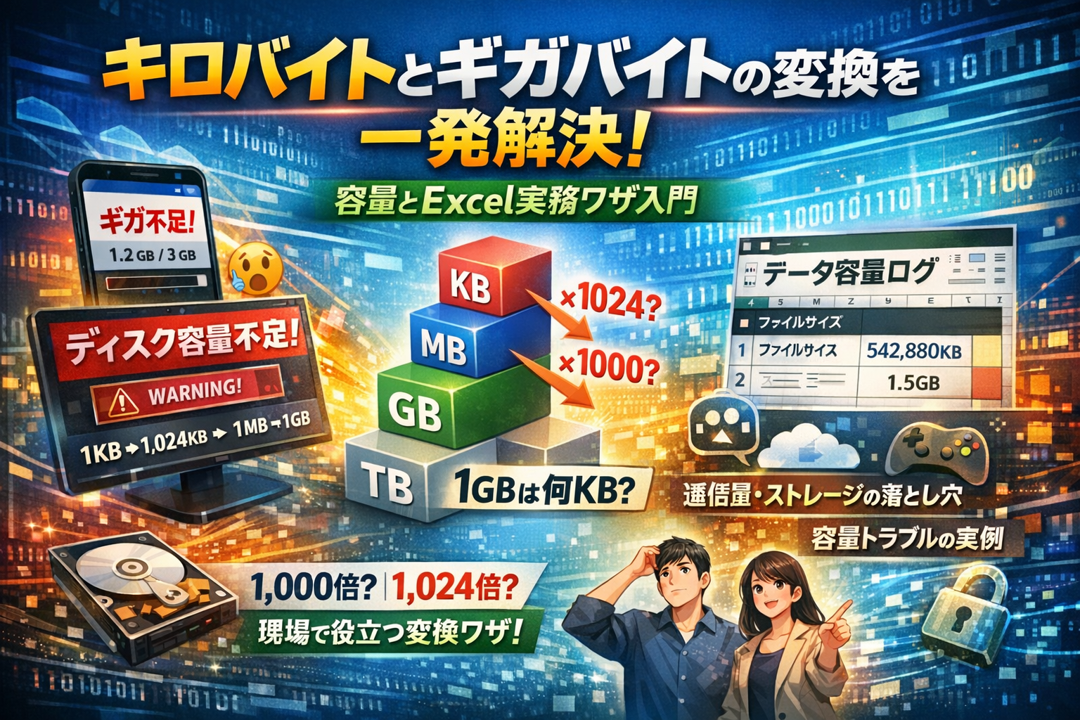 スマホの「ギガが足りません」、PCの「ディスク容量が不足しています」、Excelに並ぶ「バイト数のログ」。この3つを別々の問題として扱っている限り、容量トラブルは繰り返します。見えない損失の正体は、KBやMBやGBといった容量単位とキロバイトギガバイト変換のあいまいな理解です。
