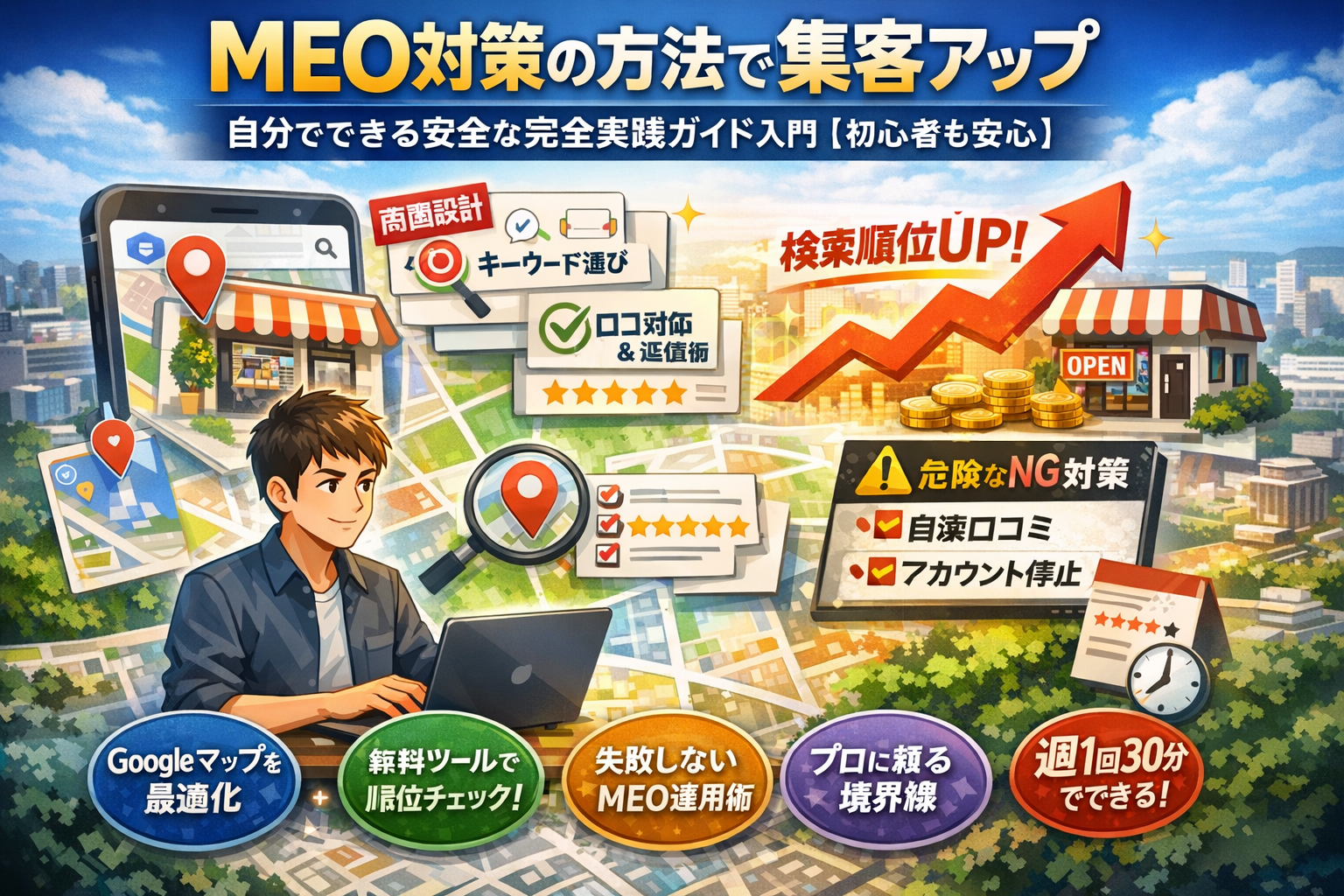 読み進めれば、MEOとSEOの違いを押さえたうえで、商圏やターゲットに合ったキーワード設計、自分でできるMEO順位の上げ方、無料ツールでのチェック方法、口コミを武器にする返信の型、そしてどこまで自分で行い、どこからMEO対策会社やツールに任せるべきかがはっきり線引きできるようになります。明日から「週1回30分」で回せる現場レベルの運用ルールまで具体的に示しますので、MEO対策をこれから始める方も、すでに取り組んでいる方も、ここで一度やり方をアップデートしてください。