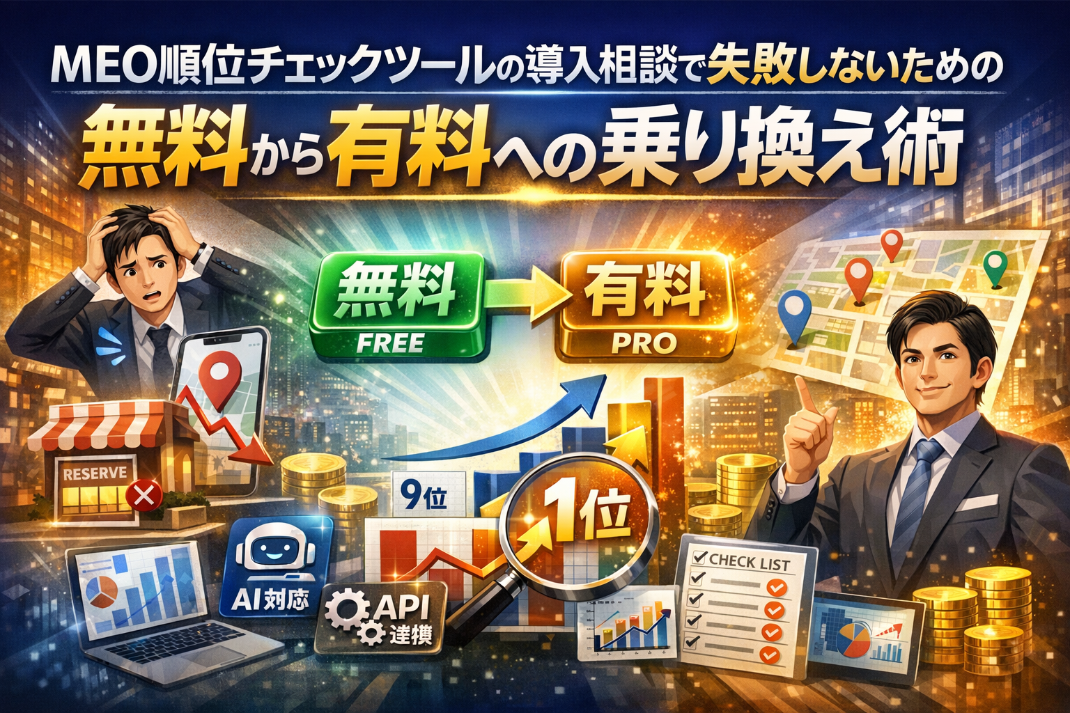 無料ツールは「今の状況を知るためのライトな双眼鏡」としては優秀です。ただ、競合が本気で分析ツールや多機能なMEOツールを入れてきた瞬間、双眼鏡だけで戦うのか、レーダーやダッシュボードを整備するのかが問われます。自社の店舗数と運用体制、そして1時間の人件費を冷静に計算しながら、「無料で済ませるメリット」と「有料に切り替えるタイミング」を見極めていくことが、結果的に一番のコスト削減につながります。