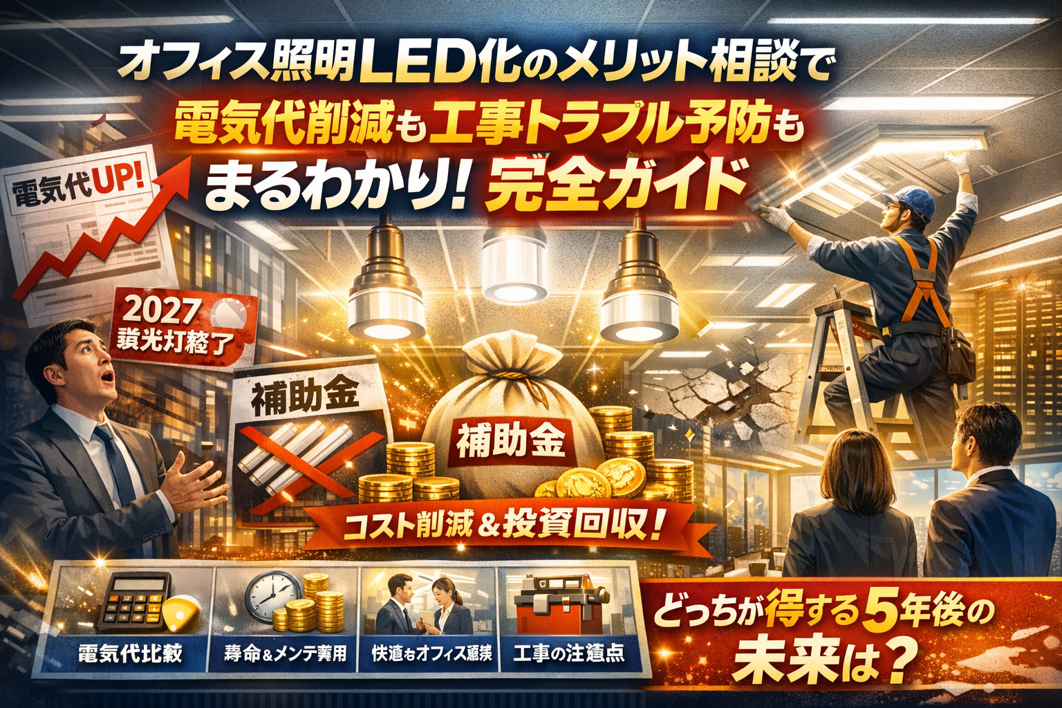 本ガイドは、オフィス照明LED化のメリット相談で本当に押さえるべき「電気代削減」「省エネ効果」「投資回収」「補助金」「工事方法」「トラブル事例」「段階導入の戦略」を一つのストーリーに整理し、自社の条件で損得が即断できる状態まで引き上げます。なぜ同じ直管蛍光灯のLED交換でも結果が分かれるのか、なぜ一気にLED化した会社ほど社内クレームに苦しむのか、現場で起きているリアルを前提に解説します。読み進めていただければ、「どの範囲をいつ、どの方法でLED化するか」「どんな業者とどう相談すれば工事トラブルとムダな投資を避けられるか」が具体的に見えるようになります。