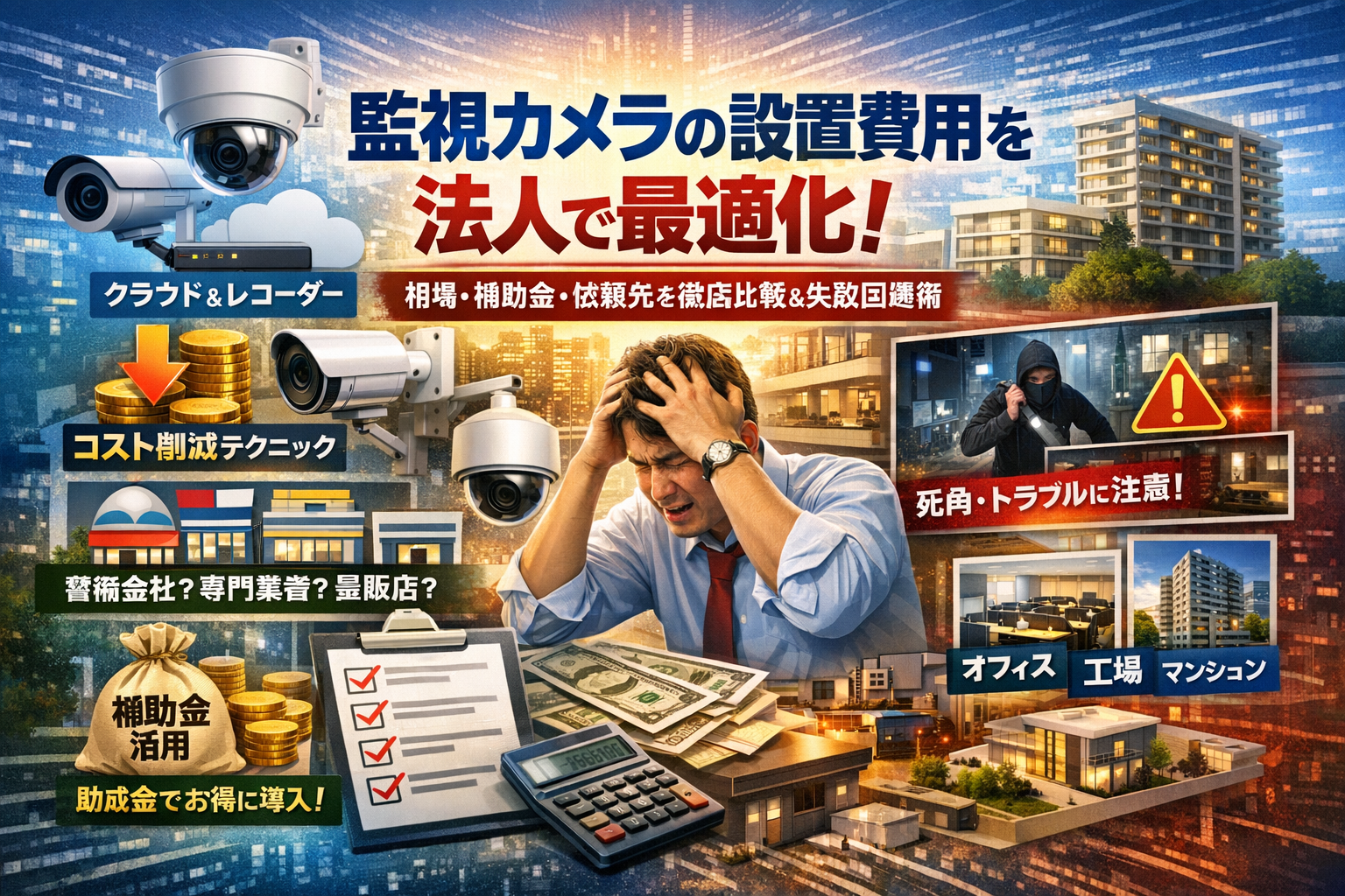 法人で監視カメラを検討すると、多くの情報が「屋内1台10〜20万円、屋外は30〜50万円、3〜4台で40万円前後」といった相場紹介で止まります。しかし実務では、依頼先の選び方や工事範囲、クラウドやレコーダー、電気代や保守を含めた設計次第で、5年トータルコストが静かに倍近くまで膨らむケースが珍しくありません。しかもその差は、セコムやアルソックなど警備会社か、防犯カメラ専門業者か、電気工事会社やケーズデンキ・ビックカメラ・ヤマダ電機・エディオンなど量販店かという「どこに依頼するか」と、補助金や助成金、経費処理・固定資産・減価償却の扱い方で決まってきます。