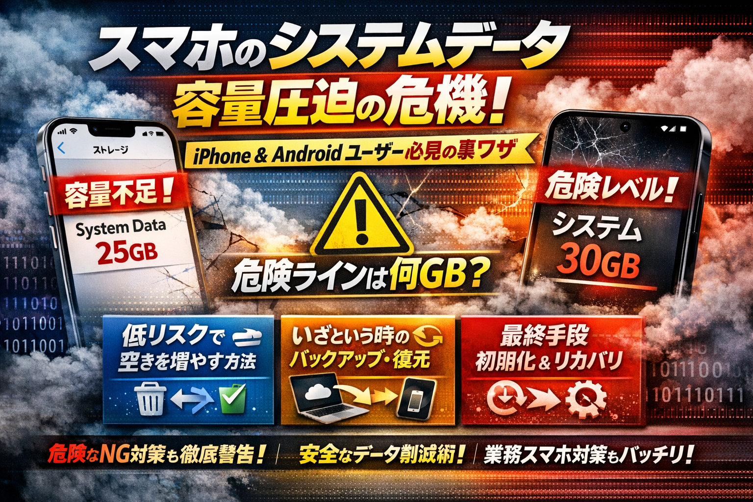 本記事では、スマホのシステムデータとは何かをiPhoneとAndroidの両方から整理し、何GBなら普通でどこから異常かという危険ラインを明確にしながら、「今すぐ空きを作る低リスク手順」から「初期化やPC経由リカバリが必要になる高リスクゾーン」までを段階的に示します。スマホ本体だけでできる現実的な減らし方、システムバックアップとシステムの復元の正しい順番、システムデータ一括削除アプリに潜むリスク、業務スマホやBYODでのDX運用に影響するポイントまで、実務目線で切り分けます。