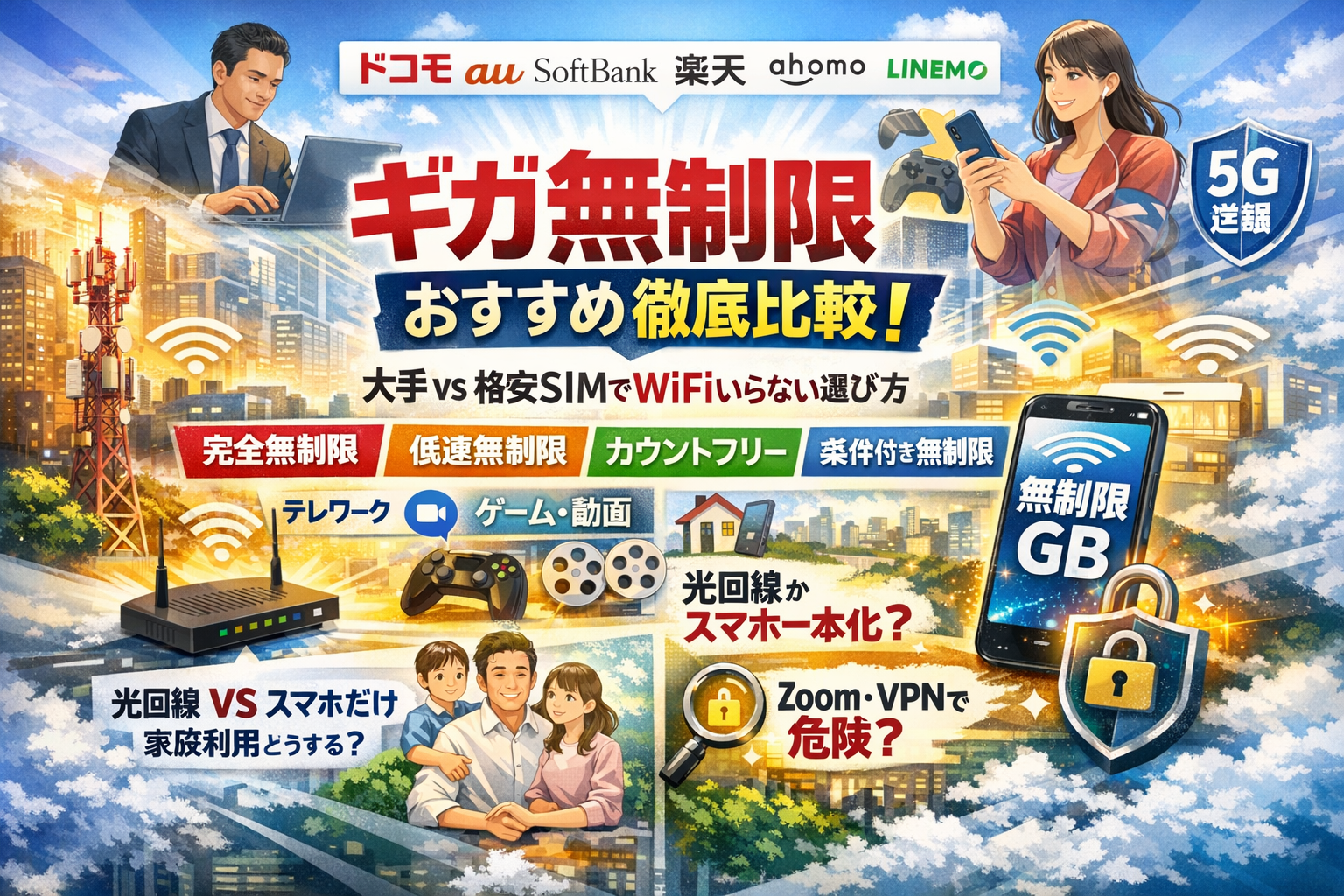 本記事では、完全無制限・条件付き無制限・低速無制限・カウントフリーの4種類を整理したうえで、ドコモ・au・ソフトバンク・楽天とahamo、povo、LINEMO、UQ、mineo、BIGLOBE、NUROなどのギガ使い放題を横並びに比較します。そのうえで、WiFiいらないスマホ一本化が成り立つケースと、自宅の光回線やギガ放題WiFiを残すべきケースを、テレワーク頻度や家族構成、ゲーム機の有無まで踏まえて具体的に切り分けます。