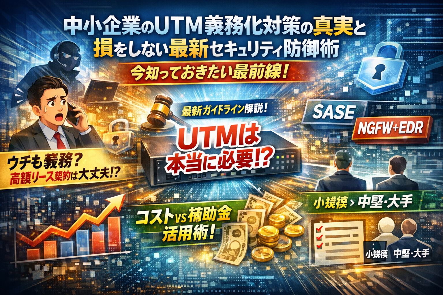 本記事では、中小企業UTM義務化対策というテーマを、個人情報保護法や善管注意義務、総務省セキュリティガイドライン、セキュリティ対策評価制度の最新動向まで踏まえて事実だけを整理し、「どこまで対策すれば法的・取引先の要求を満たせるか」を具体的に示します。さらに、中小企業のUTM導入率や被害額のデータ、UTMはもう古いと言われる背景、SASEやNGFW+EDRなどの代替、NTTなどの義務化営業トークの裏側と逆質問テンプレ、規模別の現実的な構成、補助金や自治体支援を使った損しない投資術まで網羅します。この記事を読み終える頃には、「うちにUTMは本当に必要か」「入れるならいくらまでが妥当か」「営業電話にどう対応すべきか」を自分で決められる状態になれます。