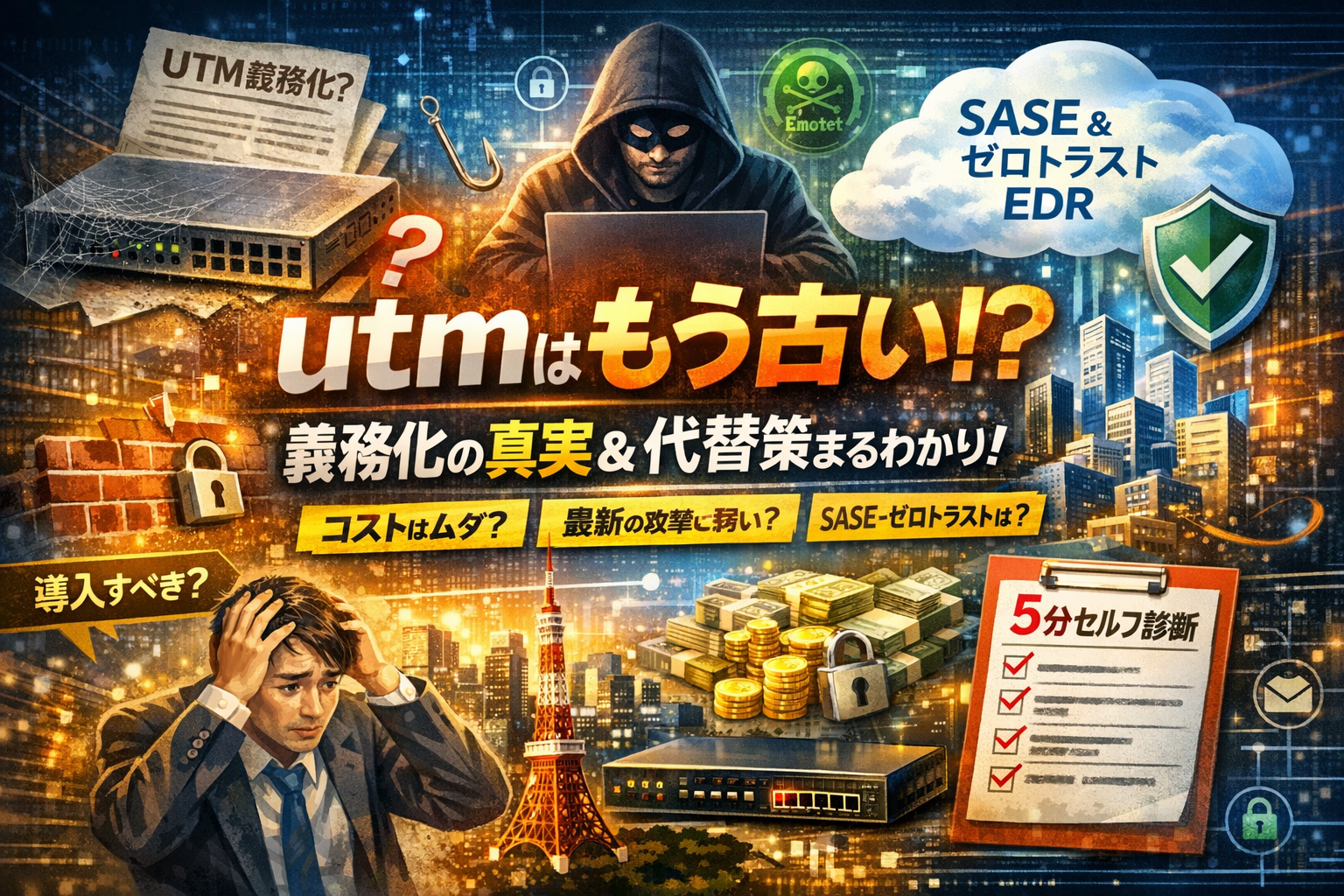 本記事では、「utmはもう古い」が話題になった背景と誤解の線引きから、UTMとファイアウォール機器やNGFW、クラウド型UTMの違い、Emotetなど最新攻撃への限界、UTM 月額料金やリース相場・買い切りの損得までを、営業トーク抜きで整理します。そのうえで、中小企業や零細企業、個人事業主ごとに「UTM導入・継続・卒業」を5分で判定できるセルフチェックと、SASEやEDRを含めた現実的な代替構成の考え方を提示します。この記事を読み切れば、「utmはもう古い」を鵜呑みにせず、自社にとって最も合理的なセキュリティ投資だけを選べるようになります。