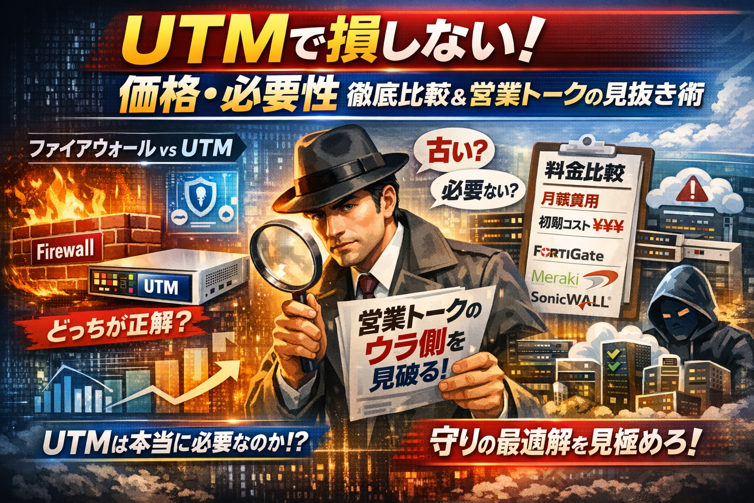UTMを調べれば調べるほど、「UTMとは?」「UTMはもう古い」「UTM 必要ない」「UTM 安い」といった言葉ばかりが増え、結局どの機器やサービスを選べば自社のネットワークと情報が守られるのか、判断に迷われていないでしょうか。実は、多くの中小企業がUTMそのものではなく「価格構造」と「守れる範囲」の誤解で損をしています。NTTのクラウド型UTMやUTMレンタルの月額料金、FortiGateやMeraki、SonicWallといったUTM製品の本体価格とライセンス費用の違い、UTMとファイアウォールやEDRの役割分担をきちんと整理しないまま導入すると、通信が遅くなる、クラウド業務がブロックされる、端末のウイルス対策が手薄になるといった「見えない損失」が蓄積します。この記事では、UTMとは何かをわかりやすく整理しつつ、「UTMは古い」という議論の本当の意味、UTM価格と月額料金比較の落とし穴、主要UTMメーカーの性格、現場で実際に起きているトラブルとその回避策、そしてUTM営業トークを見抜くチェックポイントまで一気通貫で解説します。読む前と後で、見積書と提案書の見え方が変わり、「どのUTMなら自社にとって必要十分か」が自分の言葉で説明できる状態を目指します。