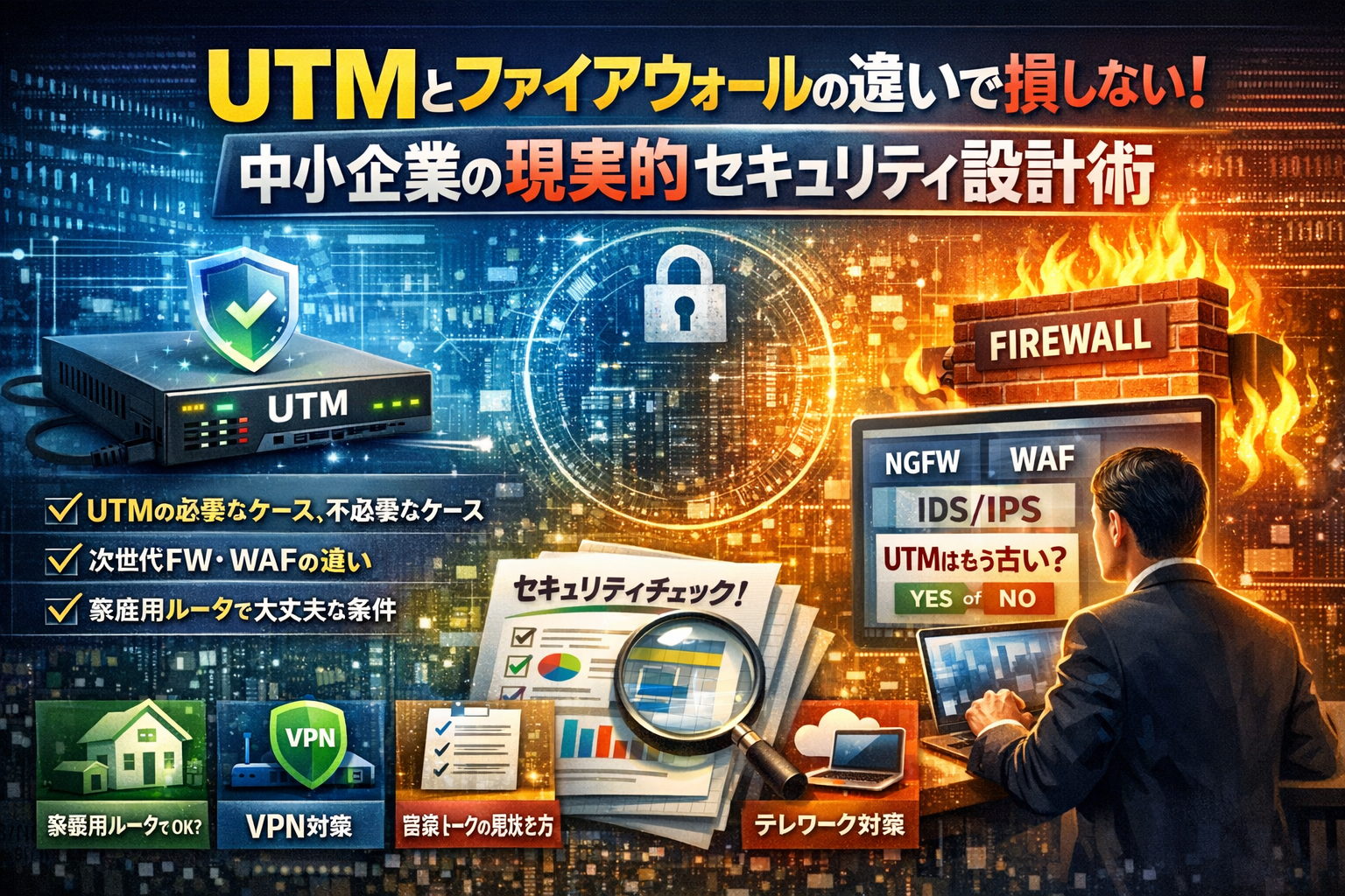 本記事では、UTMとファイアウォールの違いをレイヤーと機能で整理しつつ、ngfwやWAF、IDS/IPS、セキュリティソフトとの線引きを中小企業目線で言語化します。そのうえで、従業員規模別の現実的な構成例、UTMがいらないケースと家庭用ルータで足りる条件、UTMとファイアウォール併用が合理的なパターン、さらに「UTM義務化」などの営業トークを見抜く質問リストまで一気にまとめます。この記事を読み終える頃には、「とりあえずUTM」や「なんとなくファイアウォール強化」から抜け出し、自社の業務と予算に合ったセキュリティ設計を自分の言葉で判断できる状態になれます。