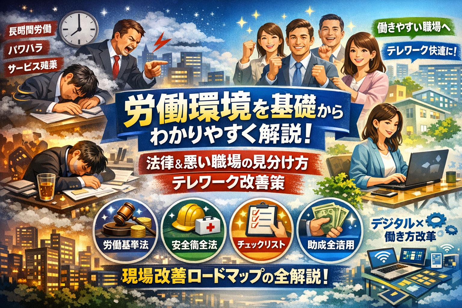 劣悪な職場環境の具体例と一発チェックリスト、日本の労働環境の現状、若者や女性、外国人労働者が直面する課題を踏まえたうえで、中小企業でも実行できる三段階の労働環境改善ロードマップを提示します。さらに、フレックスタイムや在宅勤務の制度だけ先行して現場が崩れるパターン、見た目だけのオフィス改装で終わる投資過多の失敗事例を分解し、テレワーク労働環境の整備、助成金や相談窓口の活用、デジタル化とオフィスインフラを組み合わせた現実的な打ち手まで具体的に示します。ここまでを一つの記事で俯瞰できる機会は多くありません。自社のリスクと改善の優先順位を短時間で整理したい方こそ、読み進める価値があります。